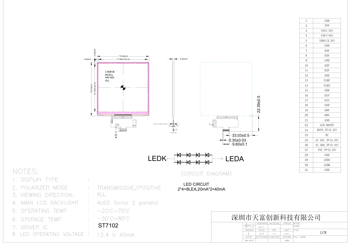 Tacaíonn modúl scáileán tadhaill in-chill IPS 3.95 orlach beag le haghaidh baile cliste le comhéadain dé-Chórais MIPI/IIC agus IC tiománaí ST7102I (30ms am freagartha tapa). Cothromaíonn backlight 4S2P LED (40mA sruth íseal) gile agus éifeachtacht cumhachta. Éascaíonn an modúl tanaí 2.2mm suiteáil dhlúth.